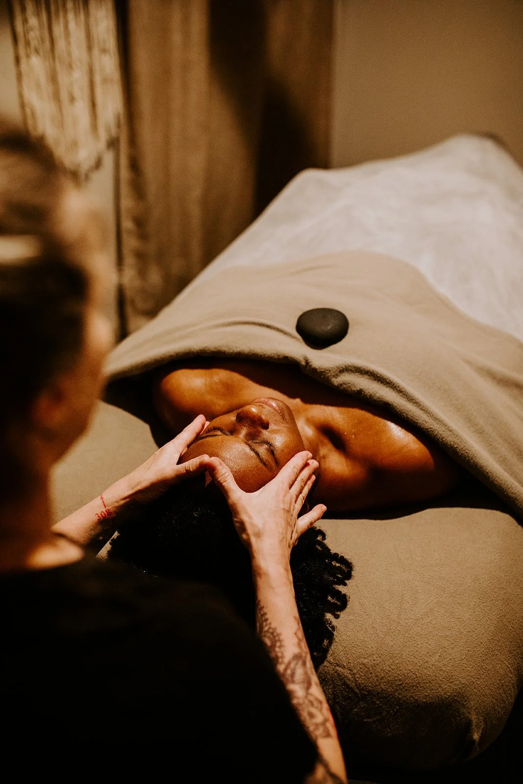 A woman with tattoos on her arm performs hot stone massage on a person lying face down on a massage table, with hot stones placed along their back.